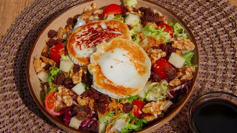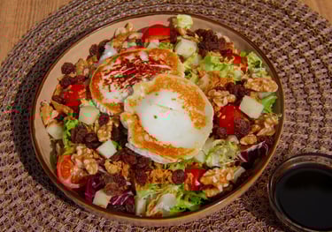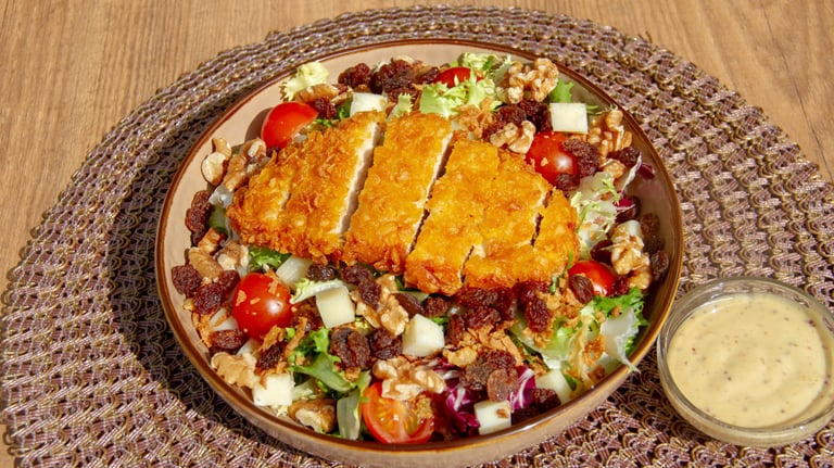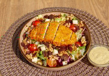Brotes verdes, tomate cherry, cebolla frita, queso, pollo frito, pasas, nueces y salsa mostaza y miel